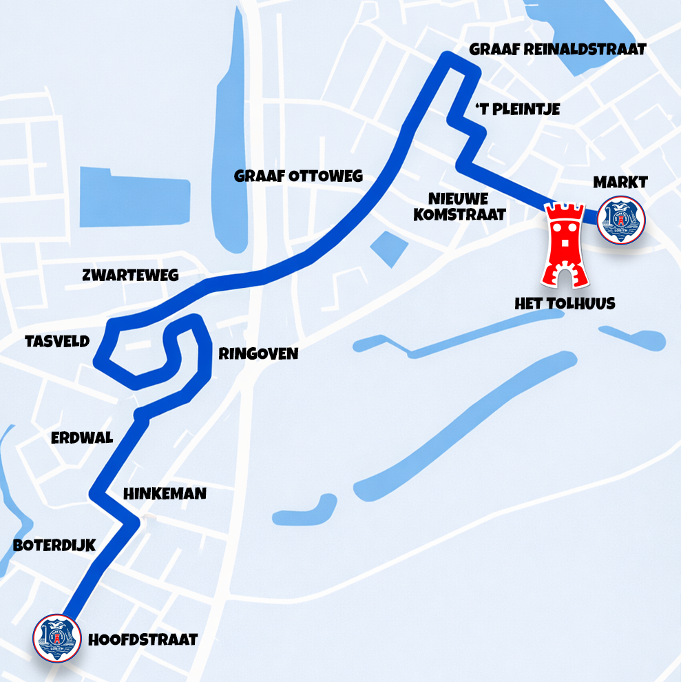 I.v.m de wegwerkzaamheden zijn wij genoodzaakt dit jaar (2026) tijdens de optocht een aangepaste route te rijden. De aanpassing in de route zal zijn vanaf de kruising Graaf Ottoweg/Nieuwe Komstraat. De optocht zal dan rechtdoor steken richting de Graaf Reinaldstraat en vanaf daar de route hervatten zoals u die gewend bent.